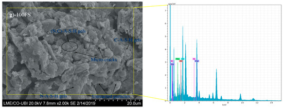 The microstructure of EAF-Slag alkali-activated binder sample (Figure 6g) shows the presence of some EAF-Slag particles that have not reacted with the alkali activator solution yet. Moreover, different microstructures were developed because of the reactive nature of the EAF-Slag. The alkaline activation of EAF-Slag provided a large amount of globular morphology due to the formation of C-A-S-H and (N, C)-A-S-H, but, the formation of N-A-S-H was observed in a lower quantity. When compared to the 100TM-AAB and binary-AABs matrixes, the microstructure shows a high formation of reaction products in the 100FS-AAB. This cluster, identified as calcium-substituted N-A-S-H gels ((N, C)-A-S-H), is associated with the only gel that has a globular morphology [22].