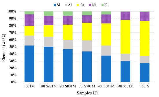 Figure 6 and Table 4 present the SEM-EDS results of different solidified alkali-activated binders’ matrix that was investigated in this study. The chemical composition results showed that the major elements in the pastes are silicon (Si), sodium (Na), aluminum (Al), and calcium (Ca). Moreover, it seemed that there was a variation in the amount of the major elements in the different samples. The number of elements (silicon, sodium, and aluminum) decreased but the amount of calcium increased due to the decrease of TMWM and on the increase of EAF-Slag dosages in the mixtures as shown in Figure 7. It was seen that the percentage of silicon (Si) was more than 51% for the sample 100TM-AAB. The percentage of (Si) gradually decreased to reach 29.96% for 50FS50TM and 26.85% for the sample 100FS-AAB prepared with 100% EAF-Slag. However, the percentage of calcium of the sample 100TM-AAB (Ca) increased from 13.67% to 47.79% in the binary-AAB sample (50FS50TM). The high calcium content was found in the sample prepared with 100% EAF-Slag (100FS), with a Ca content of more than 49%. The increase of the percentage of calcium in the mixtures leads to the development of compressive strength of the alkali-activated binders.