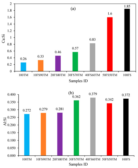 Evolution of Ca:Si (a) and Al:Si (b) ratios of the 100TM-AAB, Binary-AABs, and 100FS-AAB. The ratios values are calculated from the SEM-EDS analysis with the atomic mass ratio of all the binders.