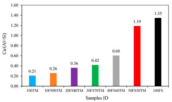 The compressive strength development of the hardened tungsten mining waste-based AABs (100TM-AAB) and EAF-Slag-based alkali-activated binder (100FS-AAB) pastes specimens, and the binary alkali-activated binder (binary-AABs) pastes specimens prepared with different blended TMWM and EAF-Slag; and cured for different periods are shown in Figure 3. The results of the compressive strength show that the 100TM-AAB sample had the lowest compressive strength value 11.23 MPa at 28 days. As for the binary-AABs’ samples, the compressive strength increased gradually when the EAF-Slag content in the mixtures increased. The compressive strength of the sample 100TM-AAB increased from 11.23 MPa to reach 20.1 MPa for the sample (50FS50TM) with an increase rate of 178.98%. Generally, the more content of EAF-Slag in the mixtures with the proportions (10, 20, 30, 40, 50, and 100 vt.%) increases, the higher the compressive strengths at all the tested ages. It is inferred that the EAF-Slag could have a positive effect on the chemical reaction process to improve the compressive strength of the binary-alkali-activated binder samples due to the chemical composition of the raw EAF-Slag. Notably, the compressive strength results of the binary alkali-activated binder follow a somewhat increasing trend with increasing of the initial Ca:Si, and K:Si ratios, and deceasing of Al:Si, and Na:Si ratios. Furthermore, there was a positive direct correlation between the development of the compressive strength results and the increase of the initial Ca:Si ratios in the mixtures as shown in Figure 4. The sample 100FS-AAB showed a higher compressive strength due to the high content of calcium in the mixtures, and the high Ca:Si ratio. In contrast, the 100TM-AAB showed lower compressive strength due to the low reactivity of the TMWM.