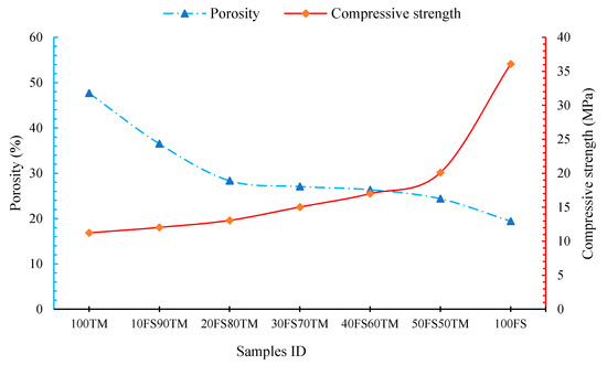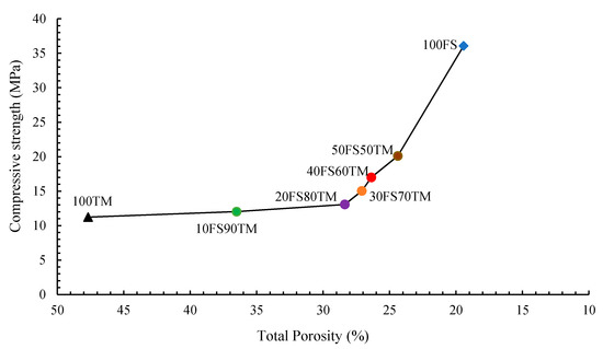 In this investigation, the porosity of all alkali-activated pastes was determined by MIP and all results are illustrated in Figure 10 and Table 5. The first observation shows that the partial replacement of TMWM by EAF-Slag has a determinant influence on the total porosity. Although the total porosity decreased with the increase of the EAF-Slag dosages in the mixtures, the experimental results show that the total porosity and compressive strength are directly correlated: the higher the compressive strength of the binders is, the lower the total porosity, as shown in Figure 11. Moreover, there is a positive correlation between the total porosity and compressive strength that was affected by the content of EAF-Slag in the mixtures. Therefore, the EAF-Slag content increased in the mixtures’ offset by lower total porosity in the samples, thus positively affecting and enhancing the compressive strength of the binary binders.