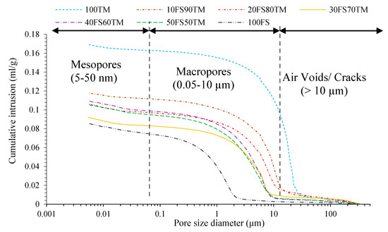 Overlay of cumulative intrusion curves of the alkali-activated binders (100TM and 100FS) and the binary-AABs specimens.