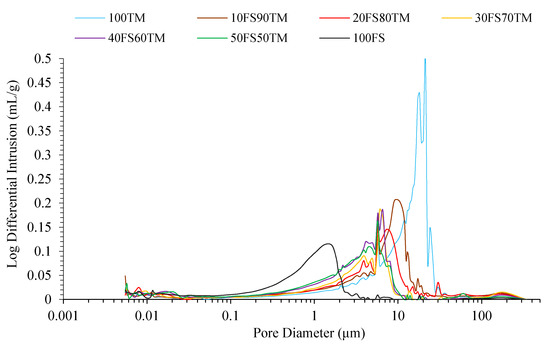Overlay of differential pore-size distribution curves of the alkali-activated binders (100TM and 100FS) and the binary-AABs specimens.