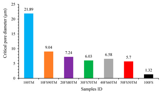 The pore diameter corresponding to the highest rate of mercury intrusion per change in pressure is known as the characteristic of continuous pore diameter (size), “critical,” or “percolation” pore diameter [32,33,34]. From the Differential Pore-Size Distributions (DPSD) curve, the highest point on the corresponding logarithmic differential pore volume curve corresponds to the critical pore (size) diameter. However, from the cumulative porosity curve the critical pore (size) diameter measured at the steepest slope of the curve. It is considered that all pore sizes refer to the percolation of mercury into the size pore diameter in an interconnected structure the critical pore diameter provides an index to compare pore structures between different alkali-activated mix designs [29,35,36]. The critical pore diameter, though, may provide a better indicator of material durability as it has an important influence on the permeability and diffusion characteristics of the alkali-activated binder paste [36,37]. However, there is no relation between the critical pore diameter and the degree of the alkaline activation or the related gel/space. The reason for this is that the pore structure depends on the quantity of the reaction products formed and how they are packed in the pore space [35]. Table 5 shows that the critical pore diameter of the alkali-activated binder gradually decreased with the increase of the EAF-Slag dosages in the binary-alkali-activated mixtures. For the 100% TMWM mixture, the critical pore diameter was 21.89 µm and this value decreased 74% by ratio to reach a critical pore diameter of 5.7 µm when 50 vt.% of TMWM was blended with 50 vt.% of EAF-Slag. The critical pore diameter significantly decreased when TMWM and EAF-Slag are blended, which influences the permeability and diffusion characteristics of the binary-alkali-activated binders. Comparing the 100% TMWM alkali-activated mixture (100TM sample) with the sample prepared with 100% EAF-Slag, the critical pore diameter decreased by 94% to reach 1.32 µm for the 100FS-AAB sample. Moreover, as seen in Figure 14 the 100TM sample has a higher critical pore diameter than the binary-AABs and 100FS-AAB sample that can be a factor of reduction of compressive strength.