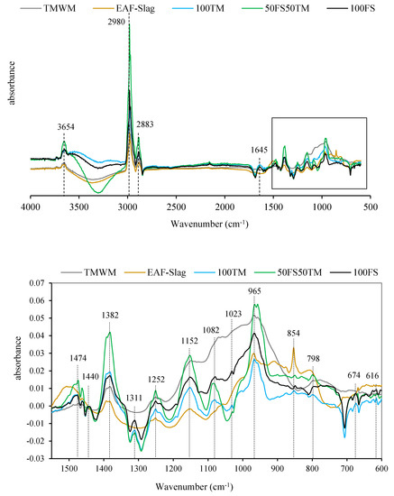 Figure 15 shows the FT-IR spectra of the unreacted precursors (TMWM and EAF-Slag), and the alkali-activated binders (100TM, 100FS, and the binary (50FS50TM)) samples. The TMWM consisted mostly in a vitreous phase comprising SiO2 and Al2O3, quartz, muscovite, and clinochlore. As the data shows, the bands generated by quartz, mullite and the vitreous phase of the TMWM overlap in the area between 1200 and 900 cm−1 generating a wide intense, where the asymmetric stretching vibration T-O (T = Si or Al) bonds appears [38,39]. The presence of quartz in the original TMWM gives rise in the FT-IR spectrum to a series of bands located at 1152, 1082, 798 and 675 cm−1. The main vibration band for TMWM is at the absorption band located at 965 cm−1 typical of the Si-O asymmetric stretching vibrations [40], this band may correspond to the asymmetric stretching vibration T-O-Si (T: Si or Al) [41]. Moreover, the peaks at 1152 and 616 cm−1 correspond to octahedral aluminum, which is partially covered by the main band (Si-O-T) indicate the presence of mullite [42,43]. The bands at 1252 cm−1 is attributed to the length as well as the angle of the Si-O and Al-O bonds in the silicates and other XRD-amorphous silicate phases [44]. The absorption bands of free O-H stretching at the band 3654 cm−1 [45], was due to the absorbs of moisture where both precursors (TMWM and EAF-Slag) were in open air. In addition, this band might correspond to the presence of muscovite as a crystalline phase in the TMWM precursor [46,47].