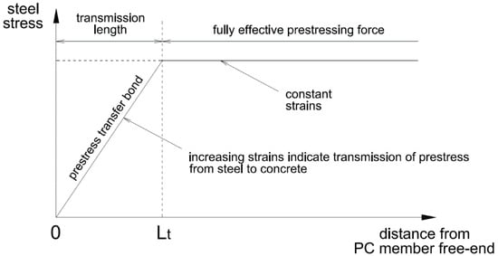 Bond in prestressed-concrete (PC) members is responsible for the correct transmission of the prestressing force from steel to concrete within the so-called transmission length (fib MC2010 []) or transfer length (ACI 318-14 []), as described in Figure 1. Additionally, bond also plays a significant role during the service life of the beam, when it is loaded to flexure, contributing to its general integrity. In this situation, the tendon stress at the nominal flexural strength is assumed to be anchored to the concrete within the anchorage length (fib MC2010 []) or development length (ACI 318-14 []). Such two situations are commonly known as “push-in” and “pull-out”, respectively. Therefore, the correct evaluation of the transmission length is of paramount importance for both service (SLS) and ultimate (ULS) limit state verification of PC members. Indeed, the knowledge of the transmission length is necessary for checking allowable stresses at the release of prestressing strands, as well as for determining the anchorage capacity of the element.