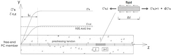 To obtain an accurate evaluation of the transmission length, the analysed prestressing tendon can be subdivided into a number of finite elements of small length , as shown in Figure 2. Starting from the element at the free-end of the PC member, where the prestress is zero ( = 0), the increment of axial stress in the tendon due to bond development within the element can be calculated from the force equilibrium along the tendon longitudinal axis: