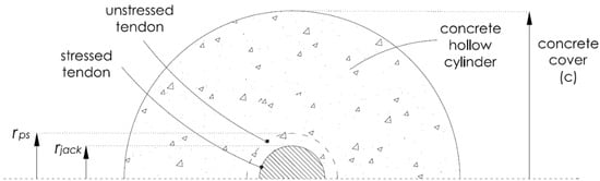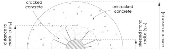 where is the tensile strength of concrete and is the distance from tendon centroid to the crack tip (see Figure 5). To determine the state of the concrete around the tendon, its circumferential strain at the interface with the strand, i.e., , can be easily calculated from Equation (14), and compared with the cracking strain, . The condition > means that concrete surrounding the tendon is cracked. In this case, the radius from the tendon centroid to the crack tip, , can be estimated as follows by combining Equation (14) and Equation (17):