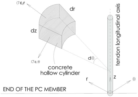 If an infinitesimal slice of the concrete cylinder of thickness dz is selected at a distance z from the free-end of the PC member, the equilibrium in the radial direction can be written as in Equation (5), neglecting terms containing higher-order infinitesimal and assuming z-independency of all the variables (Figure 4):