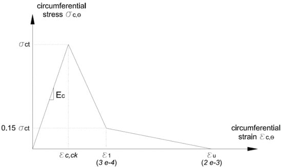 The influence of concrete radial cracking on the magnitude of bond can be taken into account through an appropriate softening model. For this purpose, the tri-linear model suggested by Han et al. (2014) [] can be adopted to represent the behaviour of concrete in tension, as depicted in Figure 6.