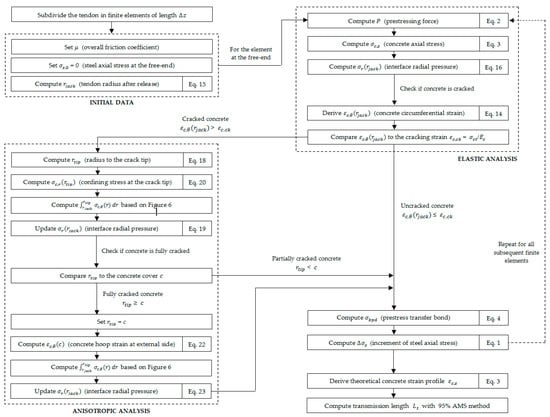 The whole procedure for calculating the transmission length of a generic prestressed-concrete member according to the implemented analytical model can be summarised as in the flowchart of Figure 8.