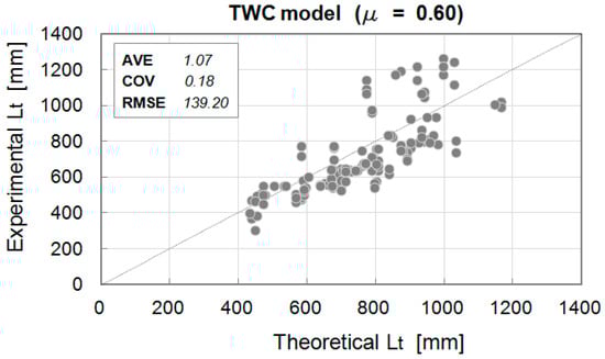 Results are presented according to commonly used statistical indicators: the average ratio between theoretical and experimental values (AVE), the coefficient of variation (COV) and the root mean square error (RMSE). Accordingly, it can be noted that the best accuracy of the analytical model, both in terms of AVE and RMSE, is provided when a coefficient of friction equal to 0.6 is selected. Instead, the lower COV is achieved with a friction coefficient of 0.7 (even though the coefficient of variation for = 0.6 is very similar). It is recalled that such a value is intended as the overall friction coefficient, combining actual frictional bond and mechanical bond. Note also that for the lowest values of , the performance of the model decreases significantly. This might be due to the fact that shrinkage effect has not been separately accounted here and it is instead included in the overall friction coefficient. Indeed, shrinkage impact on radial compressive stresses connected to friction contribution on bond mechanism is well-known and could have a relevant impact when comparing different types of concrete [,]. Figure 9 shows the graphical comparison between the theoretical values of the transmission length obtained with the TWC model, using a coefficient of friction = 0.6, and the corresponding experimental results. It can be seen that most of the data points are very close to the diagonal ideal line “experimental vs. predicted Lt”. This demonstrates the effectiveness of the analytical model in replicating the measured transmission length values.