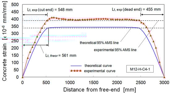 As an example, the comparison of the experimental concrete strain profile registered for specimen “M12-H-C4-1” in [] with the theoretical curve obtained from the proposed model ( = 0.6) is depicted in Figure 10. The test setup involves a 12.7 mm mono-strand rectangular specimen (b = 112.7 mm; h = 200 mm), characterised by a strand stress at release of 1396.5 MPa, a concrete compressive strength at release of 46.7 MPa and a concrete cover thickness of 46.4 mm. Moreover, a sudden release of the prestressing force has been implemented. Minor differences are present between concrete strain values, but the general development of the experimental curve is well captured by the theoretical one. Particularly, the transmission lengths in the two cases are very similar: the experimental reference value is equal to 502 mm, determined through the 95% AMS method as the average between the “cut” and the “dead” end transmission length, while the analytical value is 561 mm.