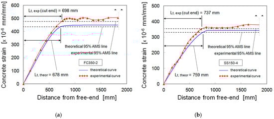 Analysis of the transmission length at the cut end of specimens “FC350-2” from Russell and Burns, 1996 (a) and “SS150-4” from Russell and Burns, 1997 (b) with = 0.6.