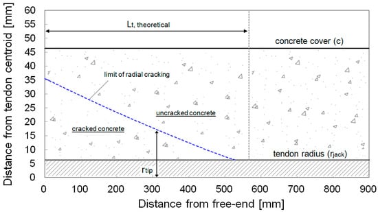 However, the magnitude of the strand expansion due to the Hoyer effect is not sufficient to allow radial cracking to reach the free outer surface of the concrete section. In fact, at the free-end of the specimen, the distance from the centroid of the tendon to the crack tip (, derived from Equation (18)) is calculated to be 35.5 mm, lower than the concrete cover thickness, equal to 46.4 mm. Then, moving towards the mid-span of the PC member, the increase in the tendon diameter due to release of the prestressing-force becomes less significant, so that the interface pressure, the hoop stress and the extent of the radial cracking diminish progressively. At a certain distance from the free-end, i.e., just after 500 mm, the whole concrete section becomes uncracked and the transmission length is rapidly reached (561 mm) as a consequence of the larger confining stresses exerted by the surrounding concrete on the strand in the central region of the PC member.