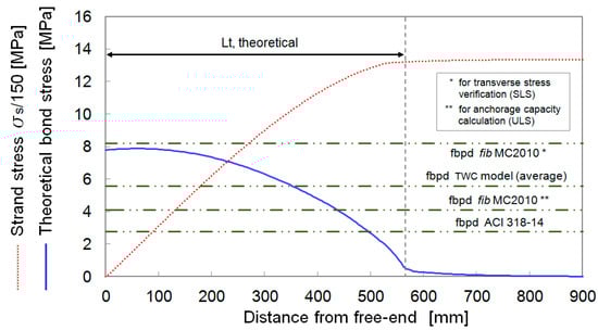 In Figure 13, the theoretical bond stress distribution along the transmission length is also shown for the considered specimen. It can be seen that the maximum value of the bond strength at the interface surface between the strand and the surrounding concrete, evaluated in nearly 8 MPa, is registered in the proximity of the free-end of the member. Here, the compressive stresses on the concrete, triggered by the increase in the tendon diameter, are relatively high. The bond stress value at any point along the tendon is proportional to the slope of the steel stress build-up curve, depicted in red in Figure 13. Accordingly, bond decreases non-linearly as the transmission length is approached. Then, once the transmission length is fully developed, the bond stress remains negligible.