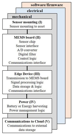 A MEMS-based sensing node has five functional elements as shown in Figure 1. The key physical components of a MEMS-based sensing node are the sensing device (II) and the edge device (III) generally consisting of a microcontroller with an inbuilt communications system. Each require power (IV) and firmware/software to operate. The sensing node also needs to be physically mounted to the asset (I), and needs to communicate to the cloud (V). From a reliability perspective this sensing node is a series system. Failure of any one element leads to failure of the node.