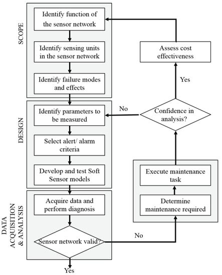 The first stage of the framework’s design process (Figure 3) is the selection of suitable indicators for the failure modes of the sensing system. This process is informed by the FMEA described previously. Once indicators are selected a sensing system can be installed to acquire data. The data are then reviewed against performance thresholds. In a simple system this can be performed manually but once there are tens or hundreds of sensing systems this will need to be actioned on-line in an automated way. To manage this process we propose the use of soft sensor models.