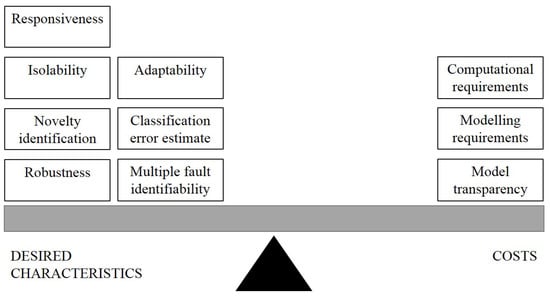 The requirements listed on the left hand side of the balance are responsiveness, isolability, novelty identification, robustness, adaptability, classification error estimate and multiple fault identifiability [43]. An ideal model would be responsive to faults without being too sensitive and generating false alarms. A system should be robust to different noise contributions. As discussed earlier in Section 4.2 the model might need to be adaptive to changes in the underlying system it is monitoring and to conditions such as sensor drift. Finally, model developers should provide an a priori estimate on the expected error measures so that the model user can compare actual with anticipated performance. These requirements should be balanced against the costs of developing and maintaining the model. These costs are shown on the right hand side of the balance and include computational requirements, modelling requirements and model transparency.