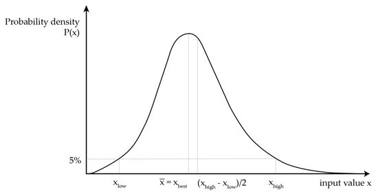- the reasonable best estimate, xbest, and the reasonable low estimate, xlow, and the reasonable best estimate, xbest, and the samples from skewed normal distributions, x, built assuming the high and low estimates, xhigh and xlow, encompassed the 95% confidence interval and the best estimate, xbest, was the mean value (). Figure 1 shows the probability density function of a skewed normal distribution, P(x), that was built using the best, xbest, low, xlow, and high, xhigh, estimates of the input value x. This is a right-skewed distribution because it has a longer tail on the left.