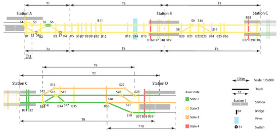 The track sections are classified into two subcategories, i.e., those with a maximum allowable speed greater than 40 km/h, and those with a maximum allowable speed lower than or equal to 40 km/h. The bridges are classified into three subcategories, i.e., concrete, masonry, and metal bridges. Each asset is considered to be in one of four possible states: