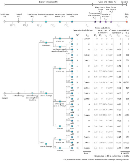 The event tree used to estimate the risk related to T1 due to traffic tonnage without the execution of the risk-reducing intervention (adopted from [87]). The societal events are described in Table A4 and Table A5 in the Appendix A.
