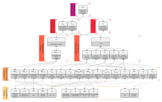 The most influencing input variables belong to Group A. The uncertainties in the values of these inputs were found to have the greatest effect on the highest-ranked assets. These input variables are the ‘additional travel time’ DT, the ‘cost of site restoration’ CQS, the ‘unit cost of time’ ut, and the ‘number of fatalities and injuries’ Z. They are all indicated in Figure 7 with red circles.