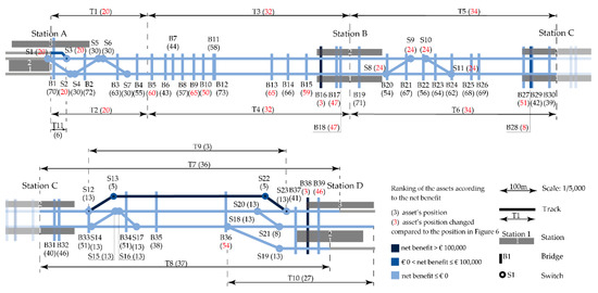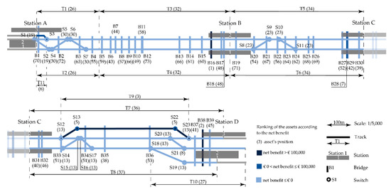 The net benefit and rank of the assets for possible risk-reducing interventions using the best estimates of the uncertain variables are shown in Figure 6. The assets were ranked from 1 to 73, and assets with the same net benefit were given the same position. The three assets with the highest net benefit were B16, B38, and T9. The net benefit of executing a risk-reduction intervention on each of these assets in the upcoming intervention-planning period was above €100,000, compared to postponing them until the next planning period. The next four assets with positive net benefit were S13, S22, T11, and B28. A risk-reducing intervention on these seven assets in the next intervention-planning period using the best estimates was beneficial because the costs and effects on service due to their renewal were less than the reduction in risk achieved by renewing them.