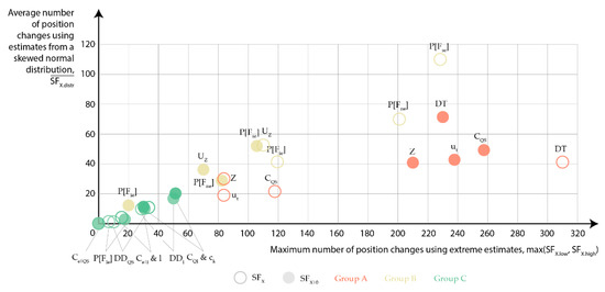 These results can be used to identify the influencing input variables whose uncertainty affects the ranking of the assets significantly. The results presented in Table 7 can be interpreted more easily by focusing on the maximum number of position changes only when the extreme estimates were used, and on the average number of position changes only when estimates from the distributions were used. This relationship is illustrated in Figure 7 with two circles for each variable: an empty circle when the position weights were not considered, SFX, and a filled circle when the position weights were considered, SFX|θ. The input variables in Figure 7 are grouped as a function of the influence of their uncertainty in the ranking of the assets:
