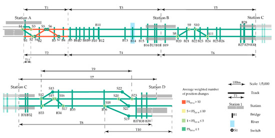 The track sections, switches, and bridges used in this case study belong to the part of the Irish railway network (Figure 2), which connects four stations, and serves both intercity and urban commuter passenger trains [84]. It consists of 11 track sections of 5 km total length and 23 switches. As the rail line crosses the city of Dublin at this part of the network, the railway is elevated above the ground level and is built on 39 bridges, which have 17,000 m2 of combined deck surface area.