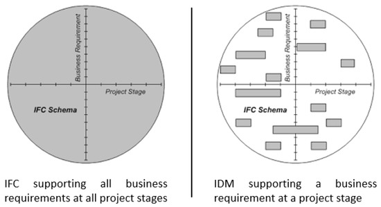 It is important to note when considering the relationship between the IFC and IDM standards that the complete IFC schema is developed in the form of a set of individual topic schematics, each of which typically represents a consistent overall idea (e.g., structural analysis, cost, materials). Upon completion, all of these topic schemas are combined in a single plan, which is the authorized working version. This contains hundreds of entities (classes), data types and property sets (the IFC components) [40], and means that the IFC can support all the business requirements in all the project stages; in contrast, the IDM only supports one business requirement in one project stage (Figure 1).