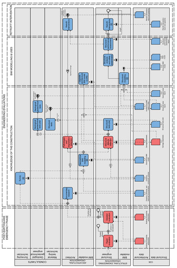 As seen in Table 1 and Table 2, all the tasks have been organized into project phases, meaning that they have been completely re-organized within a PM. The aim of the BP relates to the management of existing structures and is intended for use in the decision-making stage about a building. The graphical representation refers to the BP Model and Notation (BPMN) [44], which is a globally recognized methodology for specifying the BP in a BP model. Figure 3 only includes the PM for the post-earthquake phase; the one for the pre-earthquake period is a simplification of the version above and is obtained by excluding the tasks coloured in red in the figure. The steps in the PM are reported in the transverse direction to aid readability.