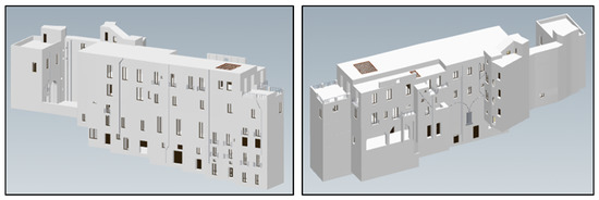 In more detail, 2D drawings (including sections, plans and elevations) have been extracted from the building’s point cloud, which was derived from the digital survey and used to create the BIM model of the palace (Figure 5). Many difficulties arose during the modelling process, because the available BIM-authoring software was developed for use in the design of new constructions. This means that even the modelling operation is difficult to carry out for an existing structure, in particular because of the uniqueness and complexity of each element, which barely meets the definition of a “parametric object”.