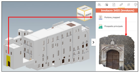 However, unlike the traditional process, and thanks to the usBIM.platform developed by ACCA Software, much of the information collected on site could be digitalized using dedicated tools. The aim was to aggregate the information in both the model and documents of a different nature. In this regard, using the online viewer usBIM.browser, which is a tool directly linked to the platform, numerous reports, point clouds and files (even those in different formats) were linked to the model directly within the CDE (Figure 6). In more detail, the damage and degradation datasheets, as well as the mesh models of any elements of architectural value in Palazzo Penne (like the front door and the façade ashlars with the coats of arms of d’Angiò and Penne), were directly linked to the BIM objects in the model to which they refer.