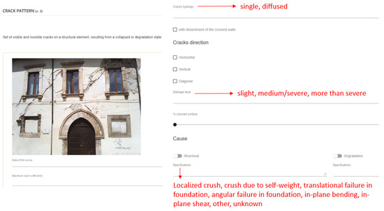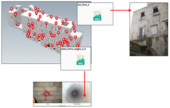 Pointers were then added to the model to identify the data collected, making it quick and easy to navigate and visualize the information now available. In this regard, in order to visualize the damage, and given the study’s goal, i.e., the management of existing structures before and after seismic events, the structural engineer located photos of the endoscopy of the walls and its identification number, while the architect unearthed images of the inspected degradation (Figure 7).