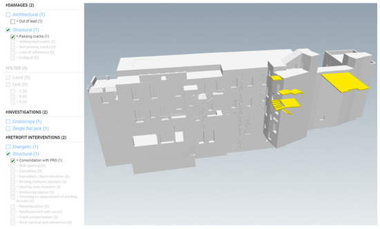 In addition, a further marker, known as #tagBIM, was added to the model’s objects and proved to be particularly useful for quickly browsing the information available. In more detail, the information with the #tagBIM marker pertained to the damage inspected and the investigations performed. As shown in Figure 8, the options provided by the #tagIM marker enabled all of this information to be cross-checked and, as a result, facilitated the research activities.