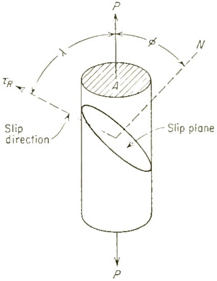 The dislocation motion between the atoms causes the formation of slip systems (slip plane or slip lines) in the atomic structure. The beginning of plastic flow resulting from tensile and shear stresses also characterizes the beginning of the dislocation movement. The Schmidian stress law according to Equation (2) states that when tensile stress is applied, the resulting shear stress in the slip system decides the dislocation movement and not the applied tensile stress [25] (p. 228). The geometrical relations of Equation (2) are shown in Figure 2.
