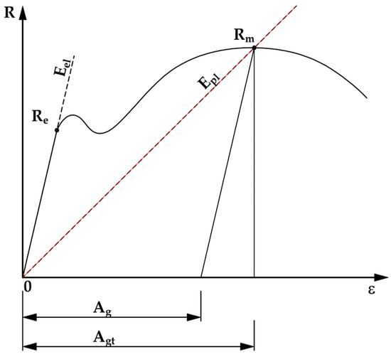 The determination of the modulus of elasticity is based on considerations to determine the elastic deformability of the material based on its tensile stresses and strains . A new parameter, the modulus of plasticity , is introduced to describe the plastic deformability of the material. Based on the assumption that the determination of can be characterized as a transition point from an elastic to a plastic state, the same procedure is used to determine the modulus. However, the maximum stress determined in a tensile test and the corresponding strain at the maximum load characterizes the transition point of the plastic uniform strain along the tensile test to the local material necking–softening. The ratio of tensile stress to longitudinal strain at this inflection point is named the modulus of plasticity according to Equation (4) and is shown schematically in Figure 3.