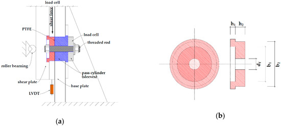 The test specimen is located between two hardened pass cylinders, which are inserted in the shear plate and the base plate. Before the test is carried out, both the threaded bars and the rebars are locked with nuts on both sides to prevent the bars from slipping through. The single-sided load causes additional tensile forces in the vertical direction, which can lead to the shear plates lifting off. Lifting of the shear plate is prevented by additional mounted roller bearings. The friction between the pass cylinders in the shear plate and the base plate is reduced to a minimum by the polytetrafluoroethylene (PTFE) foil used. Following [32,33], a 0.50 mm thick PTFE foil was chosen. The described procedure corresponds to performing suitability tests according to Technical Report 049 [33], except in these tests the anchor is not bonded in the concrete, but is screwed hand-tight between two metal plates.