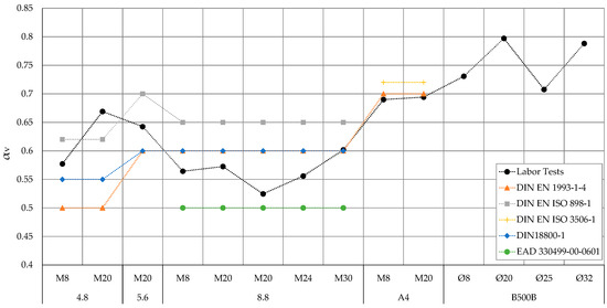 Unpublished test results [16] confirm that the reduction factor suggested in [1,2] for threaded rods can be applied as a first approximation to the safer side. In the standards of steel construction and fastening technology, Equation (1) is used as the basis for determining the characteristic steel shear resistance . Nevertheless, the information on the reduction factor varies depending on the standards. This is illustrated in Table 1.