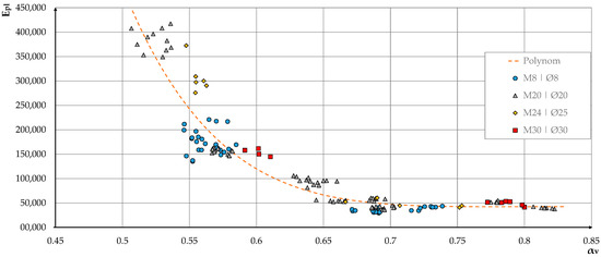 However, the regression analysis also shows that mixing the results of the reinforcement and threaded bars without taking other factors into account is not useful, because, in contrast to threaded bars, the shear failure of the reinforcing bars was determined in the shaft. Additionally, the low variation of the modulus of the plasticity of different rebars combined with a strong variation of the reduction factors 0.70 ÷ 0.80 allows the assumption that bar geometry has to be considered.