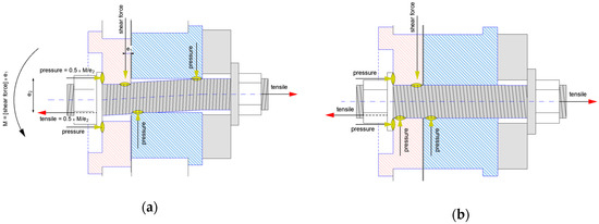 The shear force acting on the bar causes forced deformations in the longitudinal direction of the bar. These deformations manifest themselves by the formation of normal forces in the bar. The level of the resulting tensile force can easily be estimated. In Figure 9a, the secondary bending moment of the threaded nut is used to calculate the tensile and compressive components in the bar.