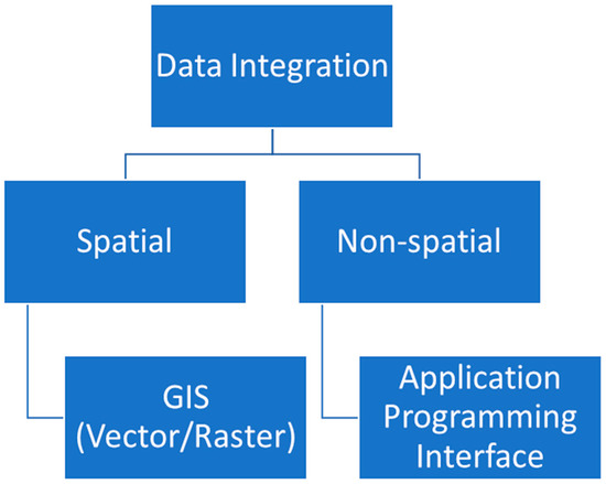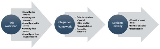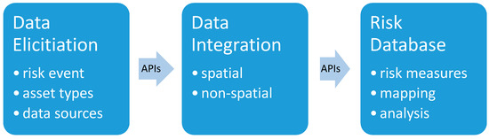 Figure 1 is a summary of the implementation process. It begins with data elicitation [14], which identifies what risk events are of interest to the agency, the assets being considered, and the sources of available data. This is followed by data integration, which involves spatial integration for data sources with spatial information and non-spatial data integration for data sources that can be linked by a unique identifier. Finally, this results in a risk management database that provides the basis for mapping or visualization and further analyses. The arrows in the diagram represents the application programming interface (API) that translates one process to the other. In the following sections, each process will be broken down.
