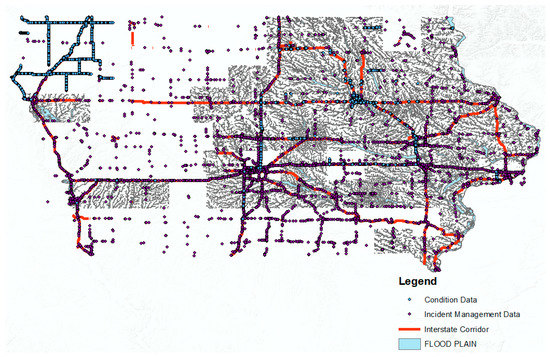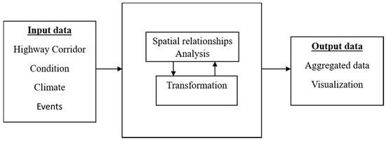 Not all data sources are point data; some are area data, such as the weather information from the Iowa Mesonet [38] that breaks the state into geographic grids, and climate data are aggregated to these grids. The same overall process, as shown in Figure 12 and Figure 13, will still apply to their integration with the corridor but with a different spatial assignment protocol that takes into account the areal characteristics.