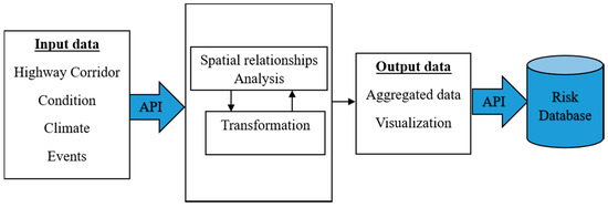 From Figure 4, the input data are usually disparate data entities. While a GIS application can integrate these data by virtue of their spatial location, it employs a tightly coupled system architecture which implies that the input must be predefined. However, these input data, especially for a risk management database, can come from sources outside of the agency or could be legacy systems within the state DOT that would require a fair amount of data pre-processing before it can be input into the GIS application. This data pre-processing is where the non-spatial data integration comes in to arrange the data into a format that can be consumed by the GIS application with the desired outcomes. In a technical sense, this is the functionality of an application programming interface, API. APIs are employed in software engineering to define permissible inputs, outputs, and controls. It is basically a set of specifications that define how disparate elements can communicate with each other [36,37]. In this risk database implementation, the API is used to prepare inputs into the GIS module as well as to package the output for integration with other analytical tools for knowledge discovery to support the decision-making. Hence, Figure 4 becomes modified by the addition of the API to result in Figure 5. The inclusion of the API enables the overall application to be packaged into an extensible single standalone program with plugin for other analytical tools or third-party visualization package. In addition, it minimizes the learning curve for state DOT risk manager by hiding all the complex programming using the API. In addition to minimizing the learning curve, it also allows for easy updates and the addition of new functionalities.