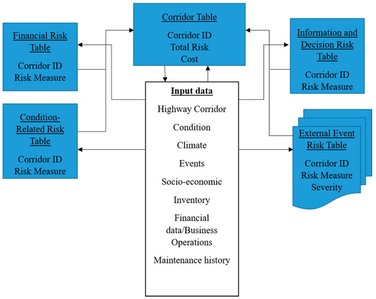 These are spread out over several database tables as shown in Figure 6. The number of database tables depends on how many external events that the state DOT identifies in its risk elicitation process. Each table is populated following the results of the spatial integration and can be populated by data from various input sources. For example, the financial risk table is populated from the highway corridor inventory data, as well as the financial/business operations data. The role of the API in Figure 5 is to map each table with the relevant fields from the aggregated data.