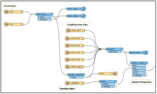 In this implementation, the FME is used as the API as it allows different data formats and sources to be consumed on the same platform. Figure 10 is an example of the API design workflow that was implemented in FME. Most transportation agencies data are already geo-enabled as point, linear (line), or areal (polygon) data. Other data includes comma-delimited files (CSV), Extensible Markup Language (XML) formats, etc. These will need to be added geometry to facilitate aggregation to the study sites (corridors). The transformation nodes in Figure 10 are where the FME implements routines for extracting only the relevant information from the data sources. This improves efficiency, as the system is not bugged down with unnecessary data processing.