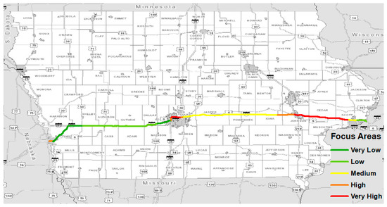 In addition, the data can be used to create a benchmark of asset performance as a very useful tool for understanding the impacts of the identified risks. In fact, using the available data to track for the identified risks is the essence of risk analysis. Statistical tools can then be employed to assess the expected performance of the transportation system under different risk scenarios. Figure 15 shows how the results of the data integration can be used for decision-making. Figure 15 presents a categorical method of presenting quantitative data to show areas of interest on the I-80 corridor. These are areas of high impact to freight travel should any risk event take place on those corridors shown in red. Additional maps can be produced based on all the underlying datasets that have been integrated to show what is driving the issue, providing decision-makers with options in their risk mitigation approaches and the benefit–cost implications of each option.