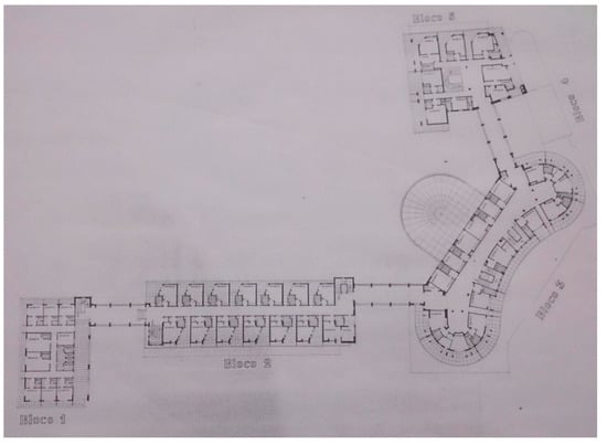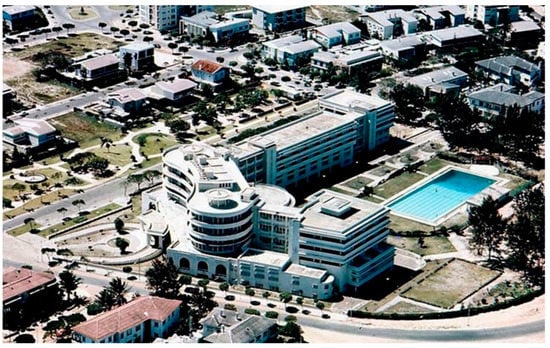 In 1953, Artur Brandão, a good friend of Salazar’s Estado Novo Portuguese regime and director of the Mozambique Company that once colonized Beira’s interior, commissioned architect Francisco de Castro to build the Grande Hotel (Figure 1). It was intended to become the main part of the success of Estado Novo politics at that time. It was intended to provide 5-star accommodation for business partners, influential people, wealthy tourists from Rhodesia, South Africa, and the Portuguese colonial empire. The hotel operated for only eight years. According to the client’s ideals, the total construction costs exceeded the budget by 300% (original cost 90,000$00 Portuguese escudos, estimated: 30,000$00 [7]), but money was well spent. With 116 rooms and a surface area of 21,000 m2, it was never profitable even by the most optimistic estimates. Until Mozambique’s independence, the swimming pool was open to the neighborhood inhabitants. The building was used for conferences only twice. Some argue that failure was not obtaining a casino license [7]. The political system believed it was immoral to play in Portuguese colonies [8].