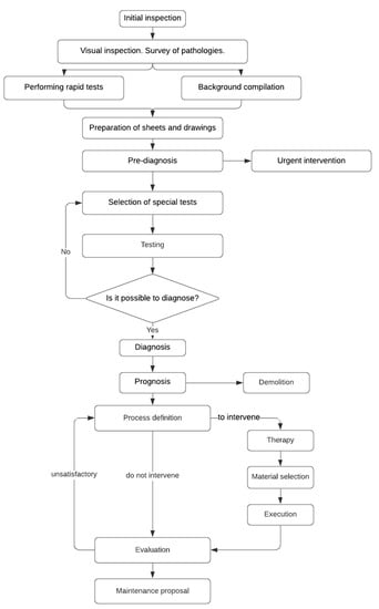 In a building’s pathologies intervention process, three well-defined parts can be distinguished: the origin of pathologies, its evolution, and the final aspect. However, the diagnosis method for its study must be crossed inversely (aspect–evolution–origin).